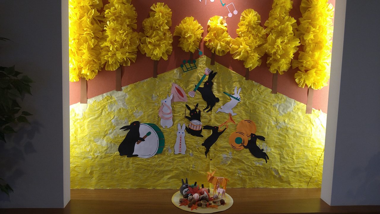 10月の玄関の壁画は 「イチョウ並木の音楽隊」職員の力作です。