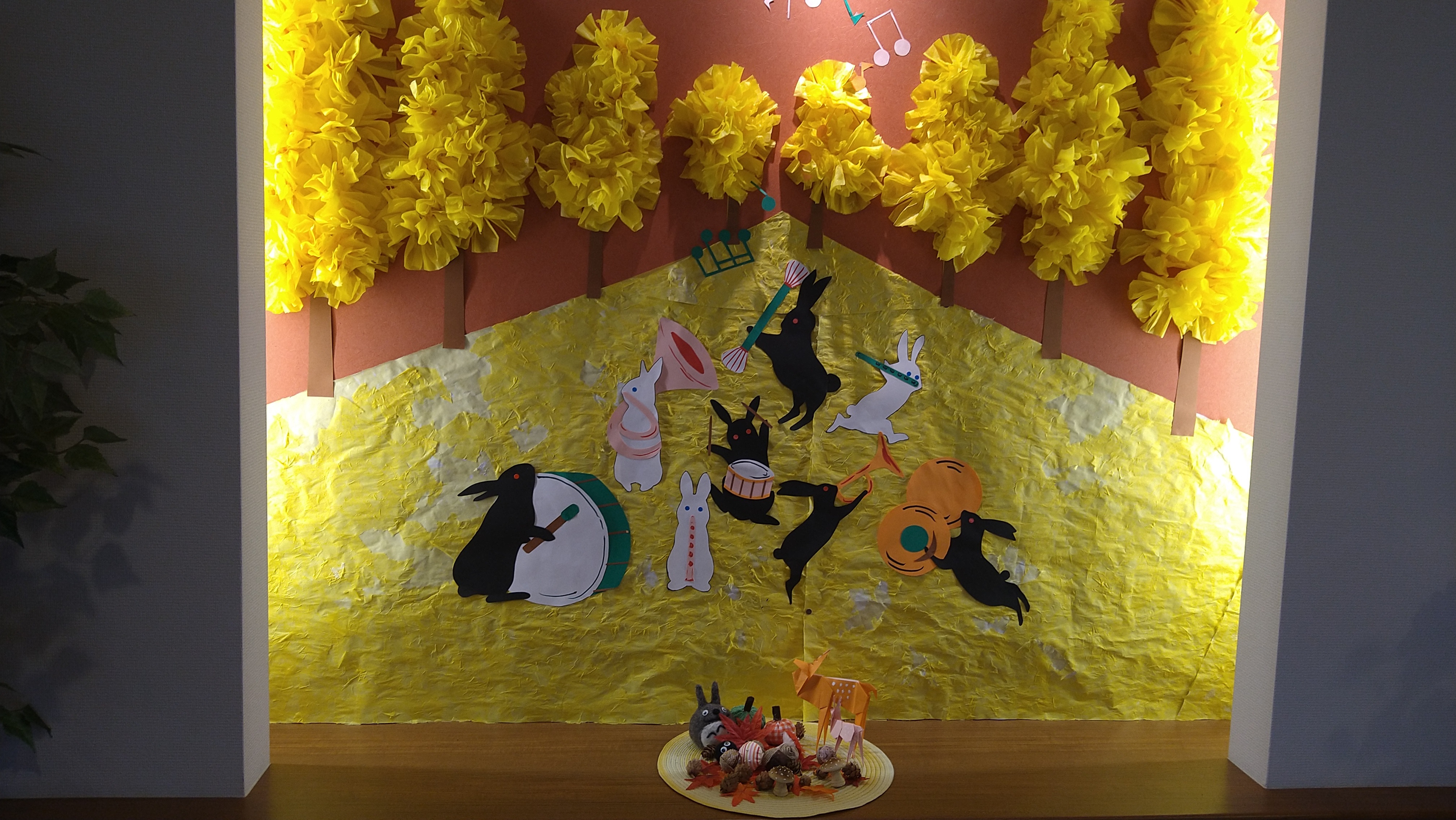 10月の玄関の壁画は 「イチョウ並木の音楽隊」職員の力作です。