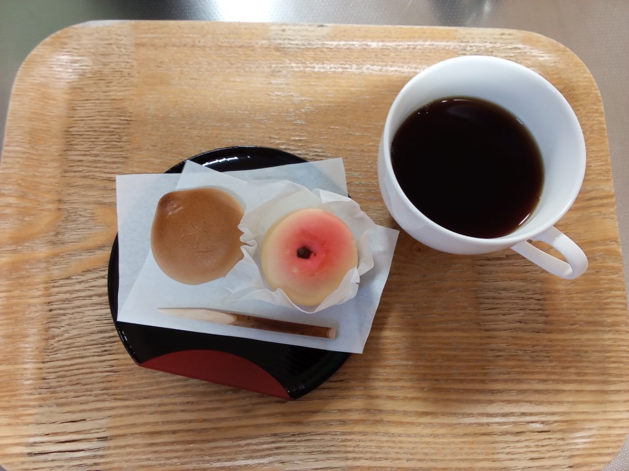 喫茶の時間に、長野県(リンゴの和菓子)と香川県(栗の和菓子)のお土産をお出ししました。