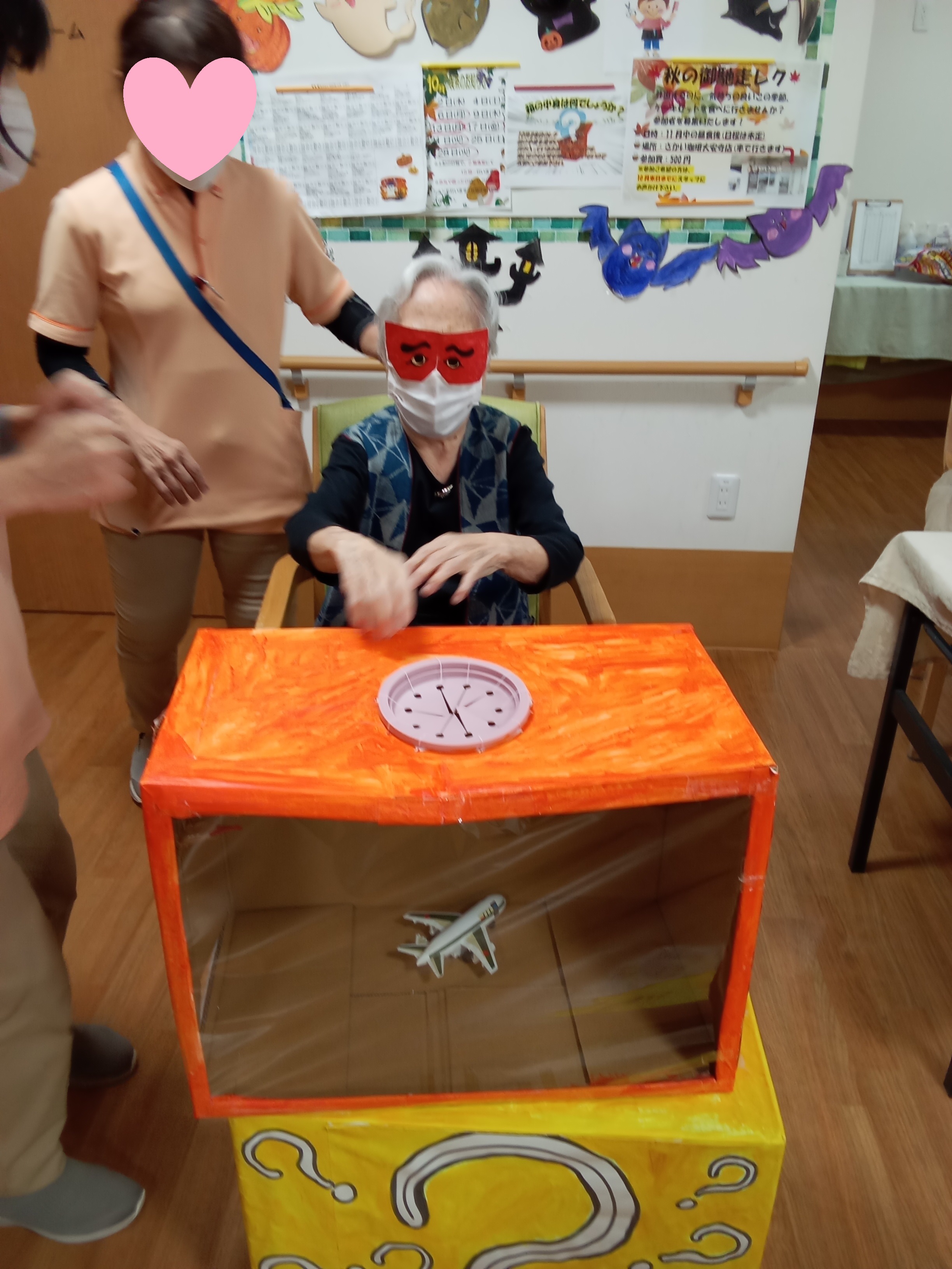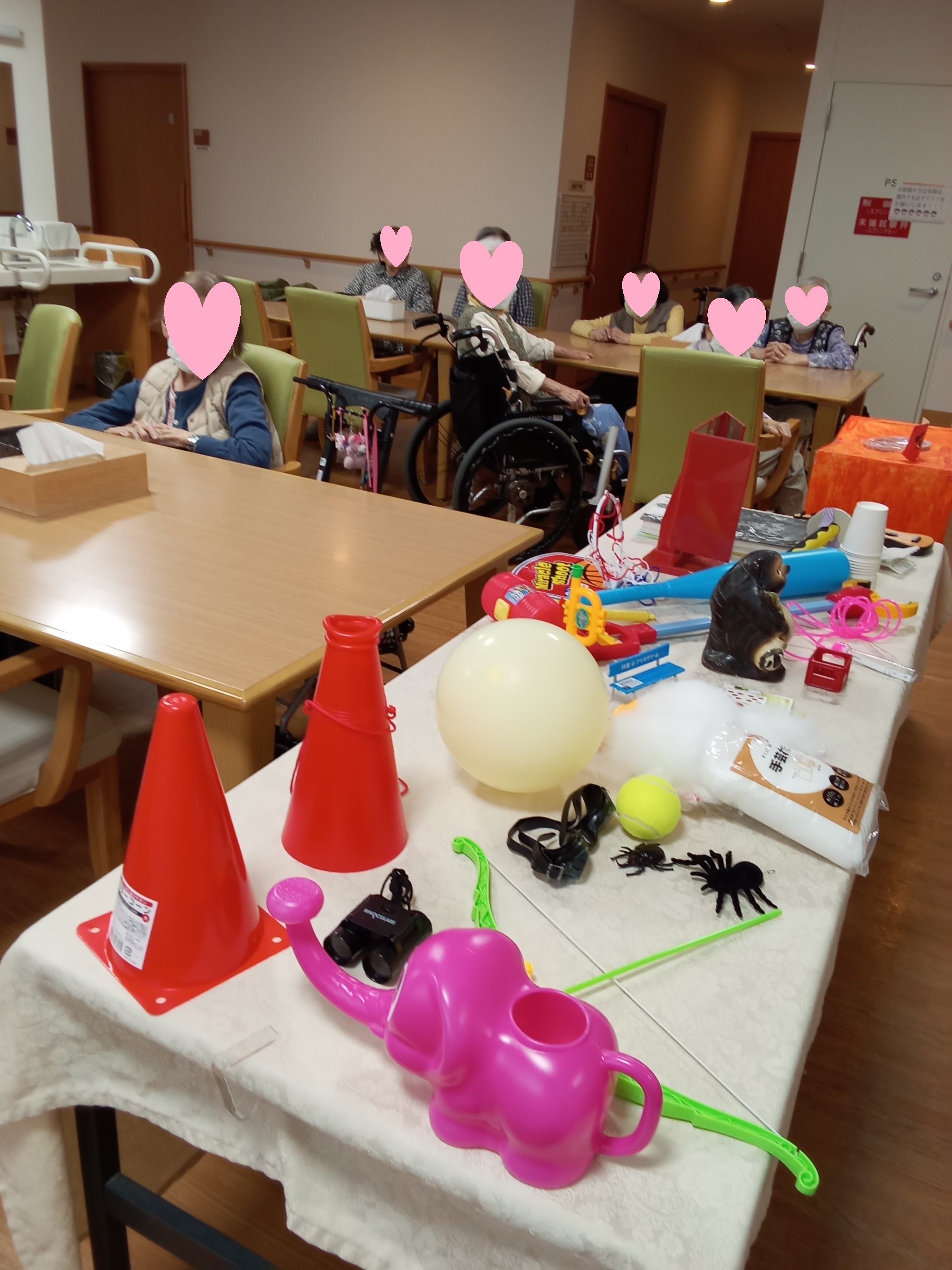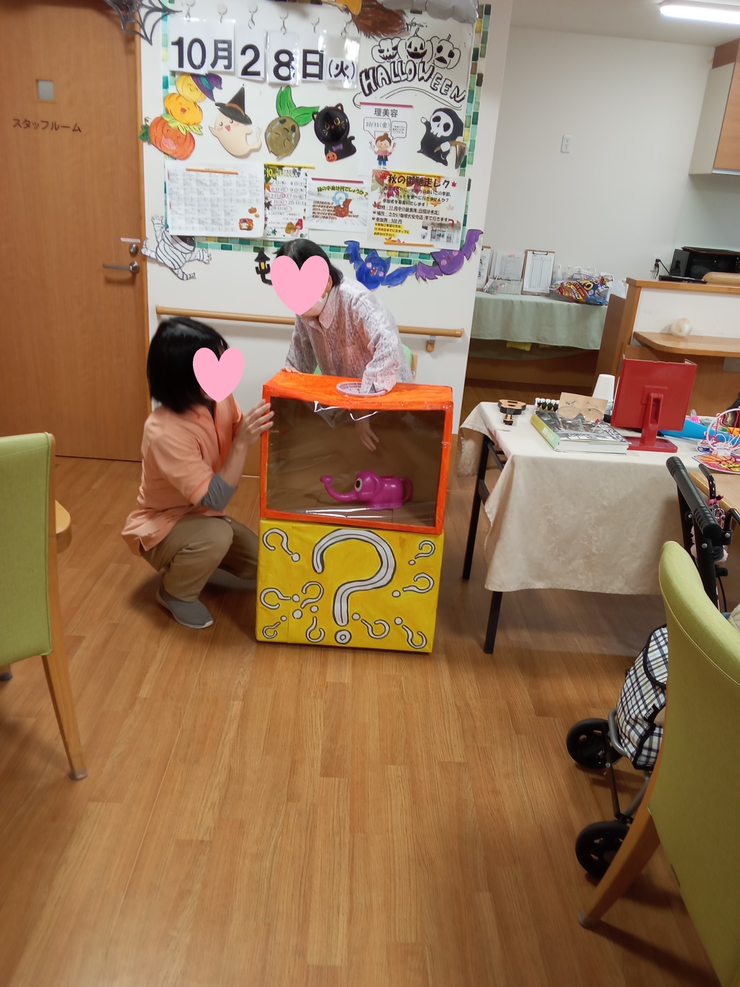 10/28のレクリエーションは、クイズ『箱の中は何でしょう?』です。スタッフが箱を手作りし、中に入れるものを持ち寄りました。テーブルに置かれた品々の中には、この遊び定番(!?)の“虫”も……ヒイイイイ(勿論、おもちゃですよ!)。「イカですか?タコですか?」と迷われ、いざ答えが分かった後の反応は「あ、蜘蛛ですか」とあっさり。さすが皆さん、山あり谷ありの人生のご経験者。動じず。このクイズは、形がはっきりした物の方が分かりやすかったようです。