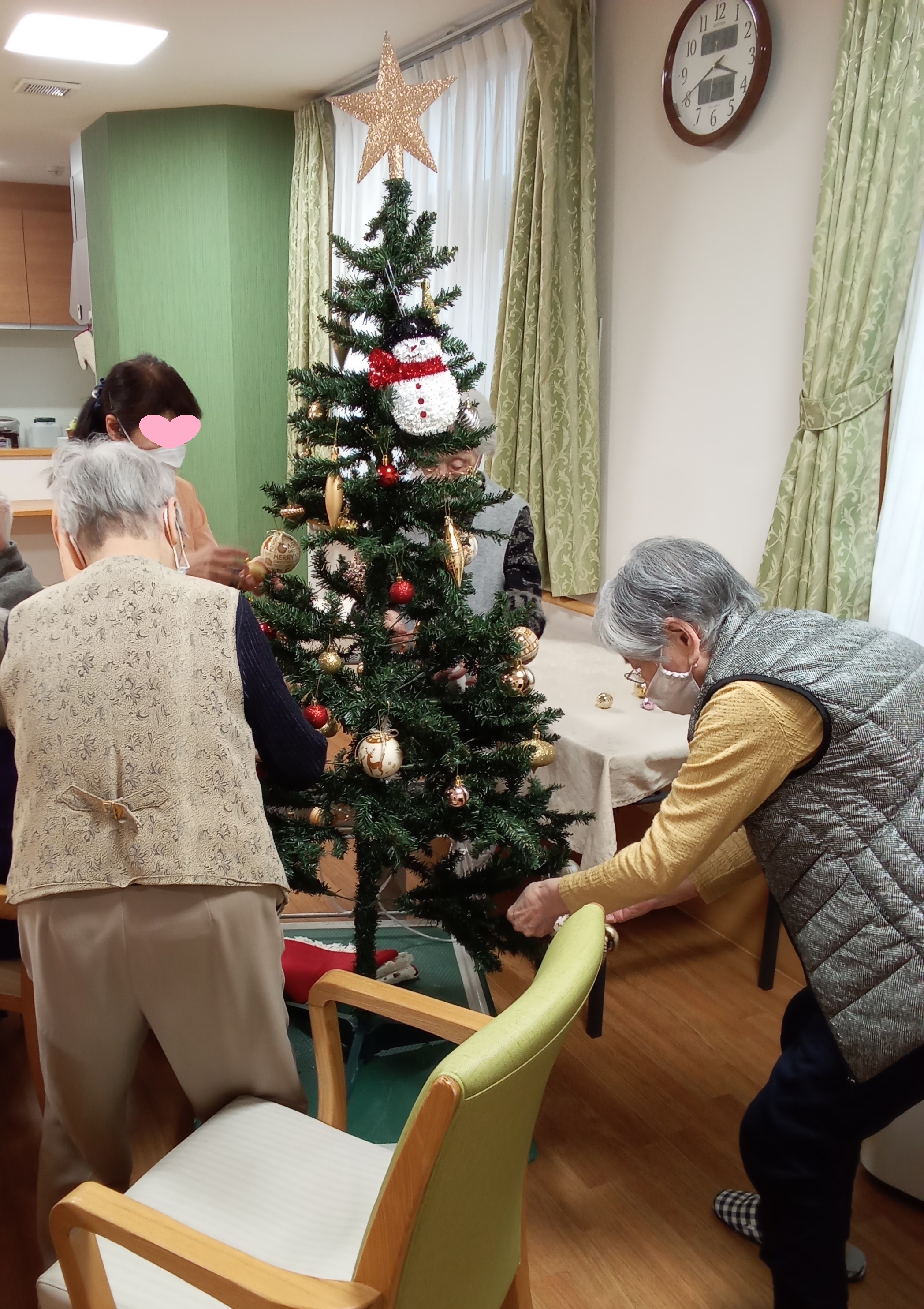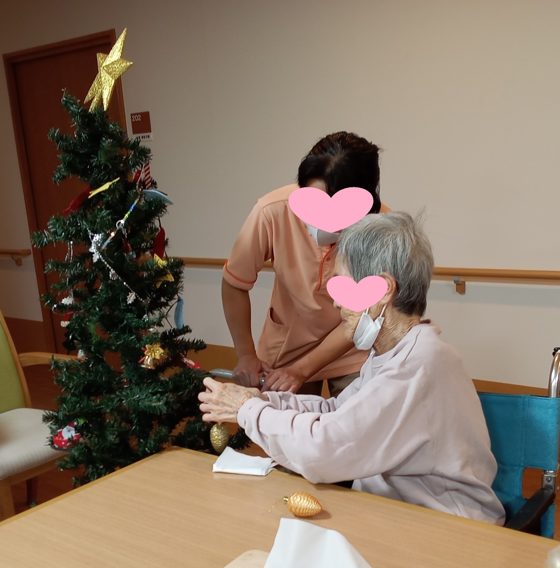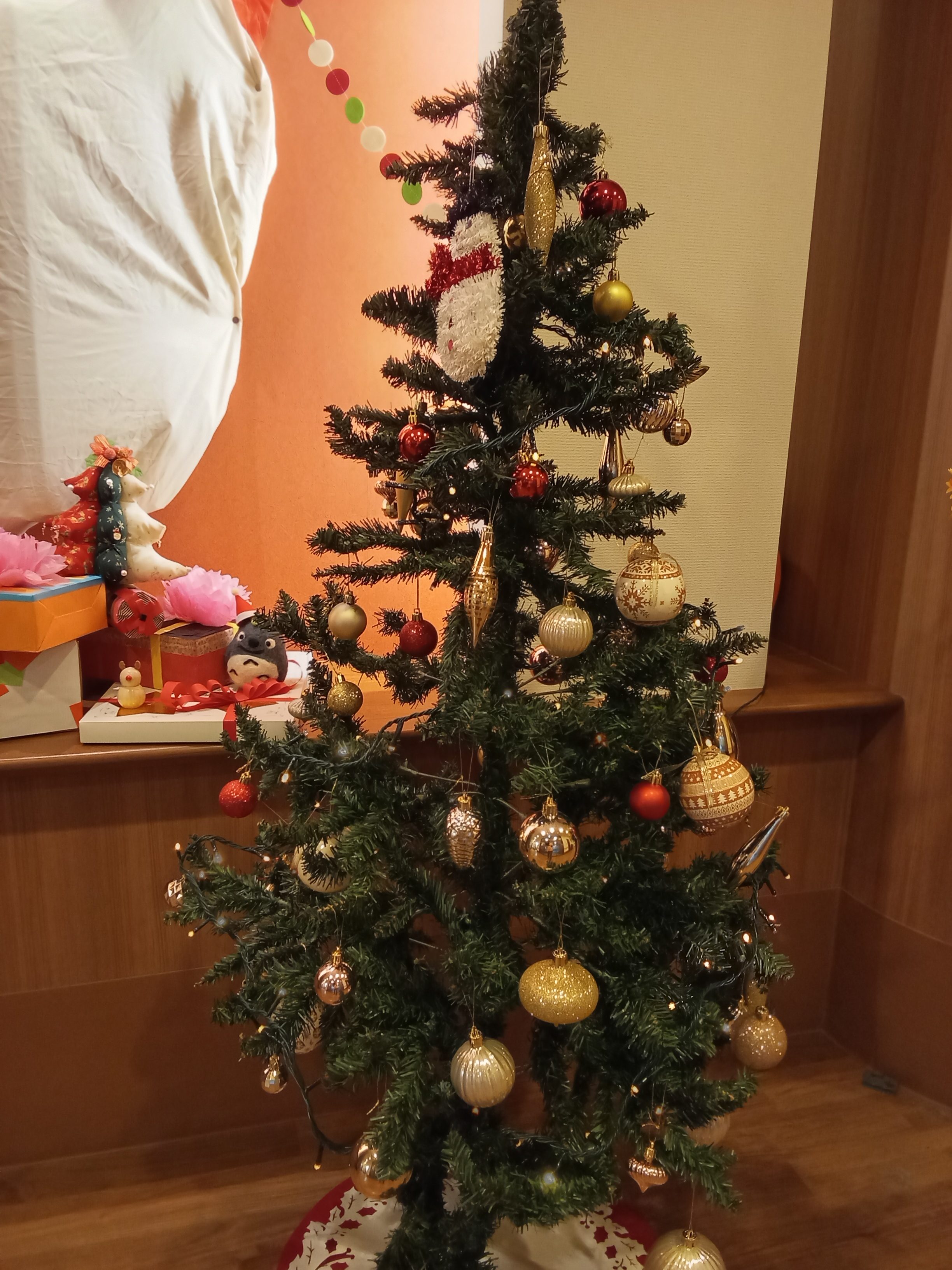 壁絵のサンタクロースといっしょにお楽しみいただけるよう、大きいツリーは玄関に設置しました。毎年恒例ですが、目にすると皆さん「きれいねえ」と喜ばれます。