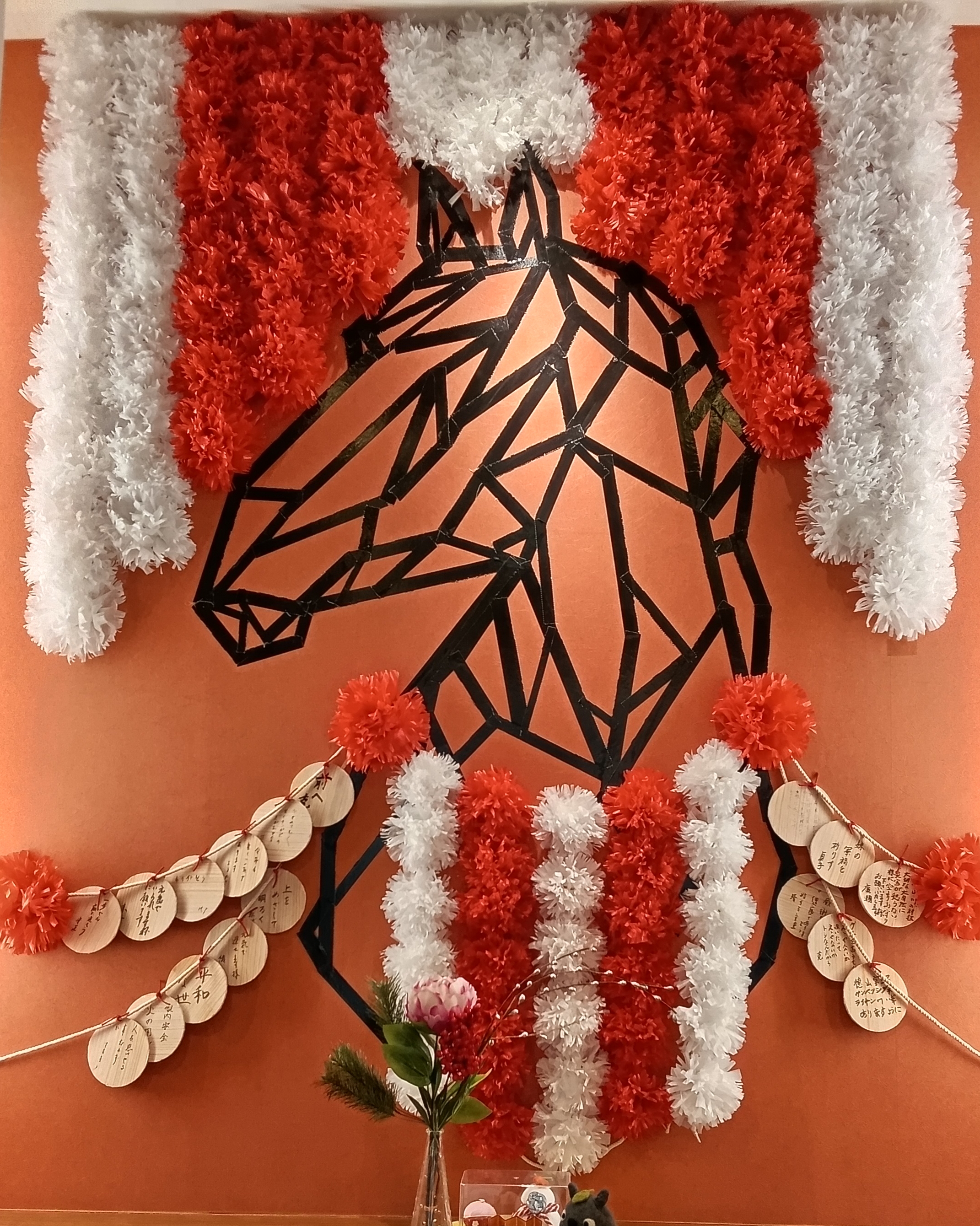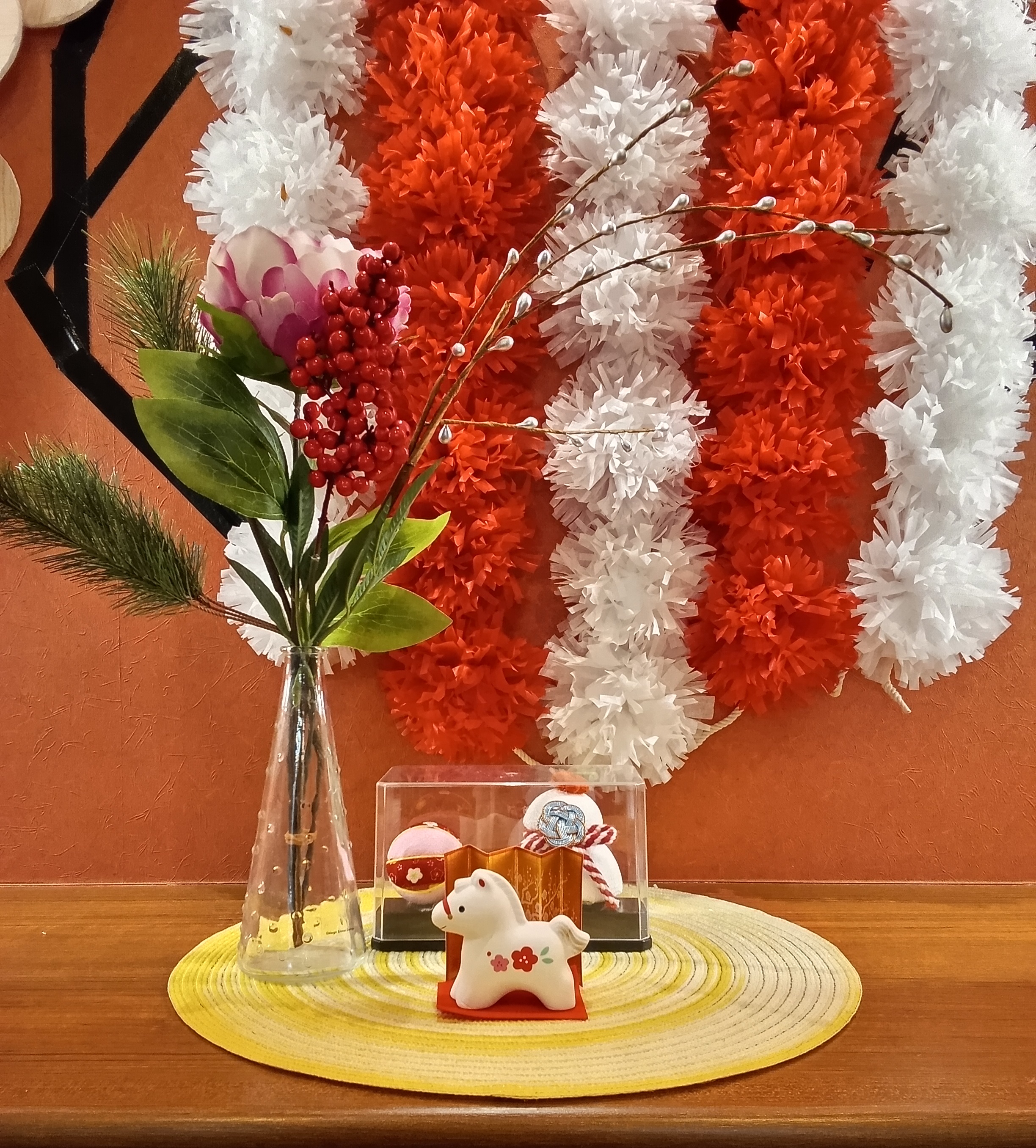 一月のエントランスは、今年の干支の「馬」をモチーフにしました。おめでたい紅白の飾りや絵馬は、入居者の方々で作って頂きました!